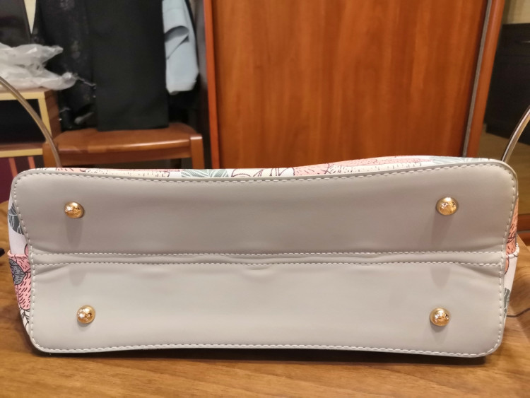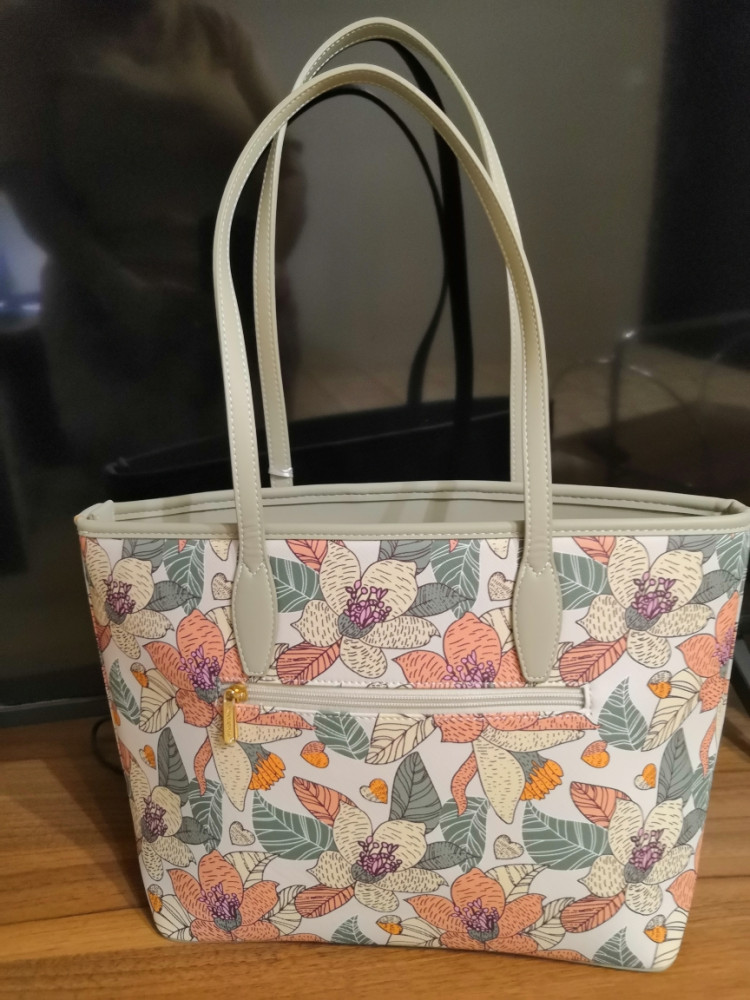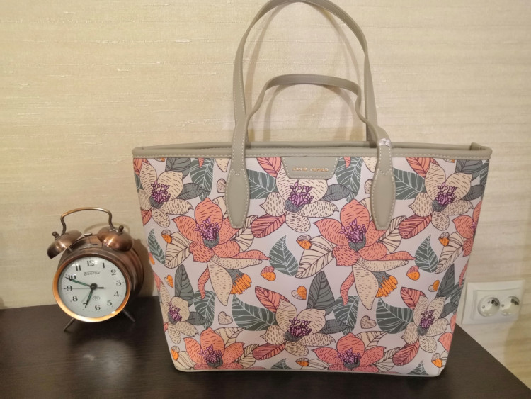 Давно хотела такую сумку на лето. Принт - цветочки с листочками на белом фоне в очень хорошей цветовой гамме: зелено-желто-коричневые тона. Не ярко, но по-летнему и точно не буде видно, что сумка где-то запачкалась. Ручки-лямки на плечо, очень правильной длины. Можно носить и в руках и на плече. Сумка не будет "сидеть" под мышкой и как раз опирается на бедро. Хороший размер. Не очень большая, но и положить в нее можно много. Внутри карманы для телефона и визитницы, один внутренний на молнии, один на молнии внешний. Сумка мягкая, раскрывать ее и класть вещи в нее будет удобно. На дне железные "кнопки", чтобы защитить низ сумки, правда невысокие. Один большой недостаток для меня - это то, что в сумке только одно отделение. Если бы могла найти такую же, но с двумя отделениями или двумя молниями, конечно, поставила бы 5 звезд, но увы, производители обо мне не подумали. Те, кто любит, чтобы все лежало в одном месте, будут довольны таким вариантом.
